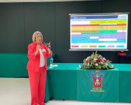 La ponencia fue impartida por la Mtra. Rosa Eugenia Velasco Briones, Directora de Educación Propedéutica del Sistema de Educación Media Superior, y tuvo como objetivo hacer del conocimiento el nuevo enfoque de las Trayectorias Académicas Especializantes y de Vinculación (TAEV’s), con la finalidad de integrar herramientas pedagógicas- didácticas en el proceso de aplicación de éstas a partir del siguiente ciclo escolar.